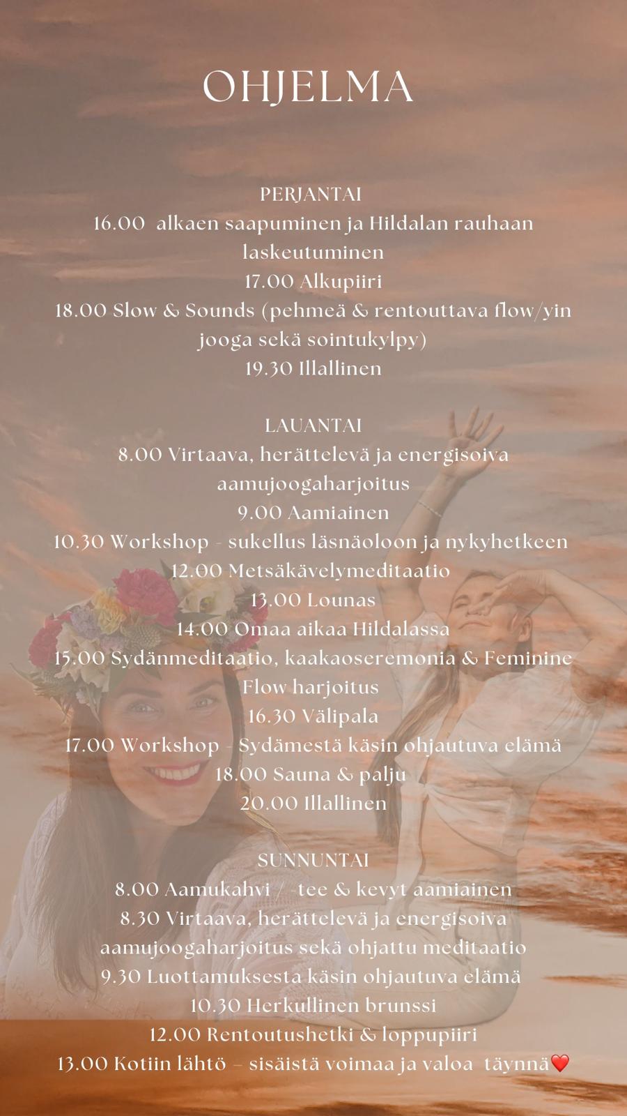 Hinta sisältää kaikki ruuat, yöpymisen, saunan ja paljun, ohjatut tunnit, workshopit ja seremoniat.